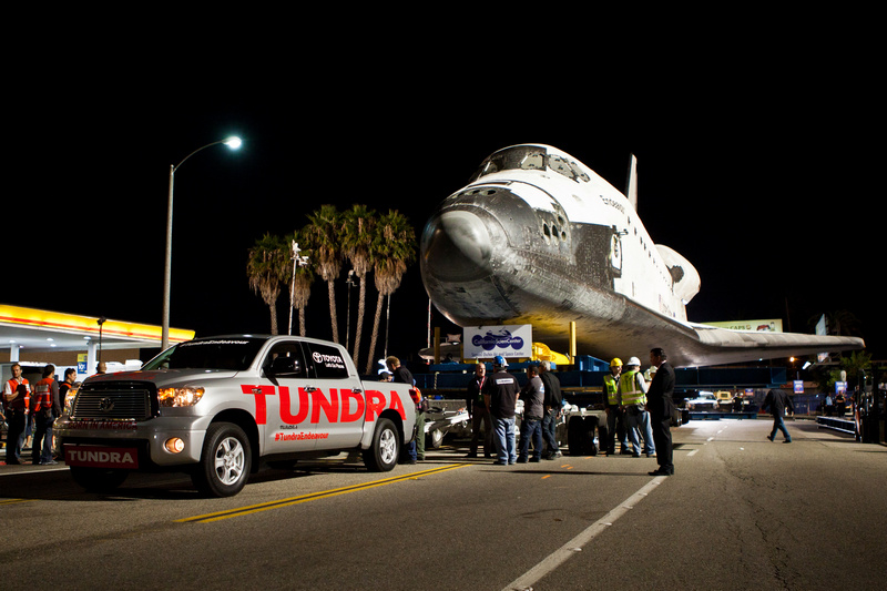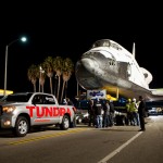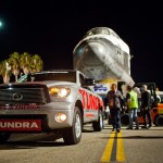 A Toyota Tundra half-ton pickup truck without any special modifications successfully towed the 150,000 pound space shuttle Endeavour across a bridge spanning the nation’s busiest freeway on Friday night, Oct. 12. The tow was a result of a 20-year partnership between Toyota and the California Science Center to raise awareness of the space program and continue public education through exhibits and events. The Tundra was piloted by longtime Toyota professional driver Matt McBride. Riding along was Garrett Reisman, one of the astronauts aboard the orbiter when it traveled to the International Space Station in 2008.